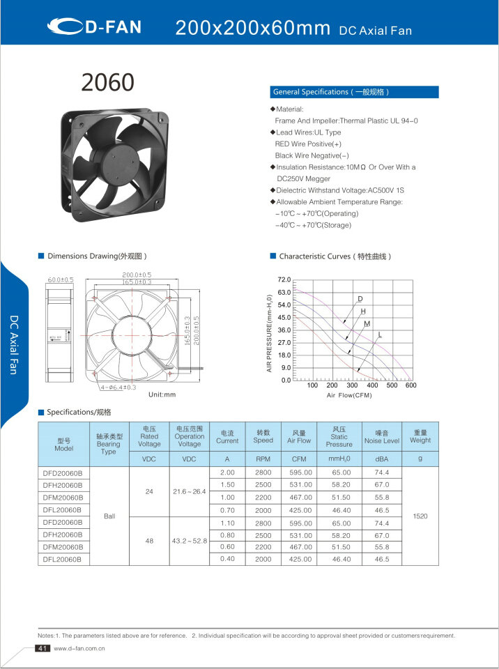 材料: 框架和叶轮:热塑UL 94-0 引线.UL类型 红色导线正极(+) 黑线负极(-) 绝缘电阻:10MΩ或以上,带DC250V高阻表 介电耐压:AC500V 1S 允许环境温度范围: -10℃-+70℃(运行) -40℃-+70℃(储存)